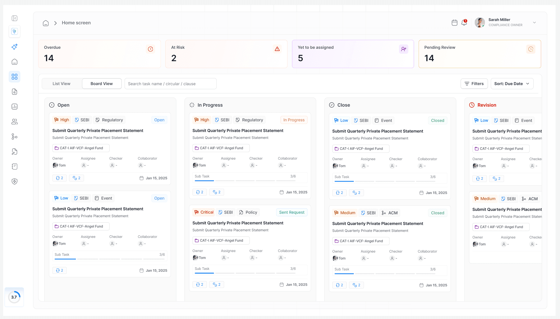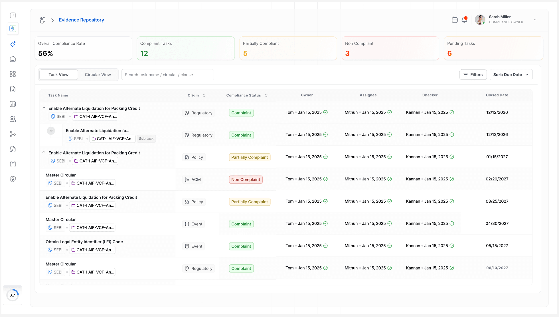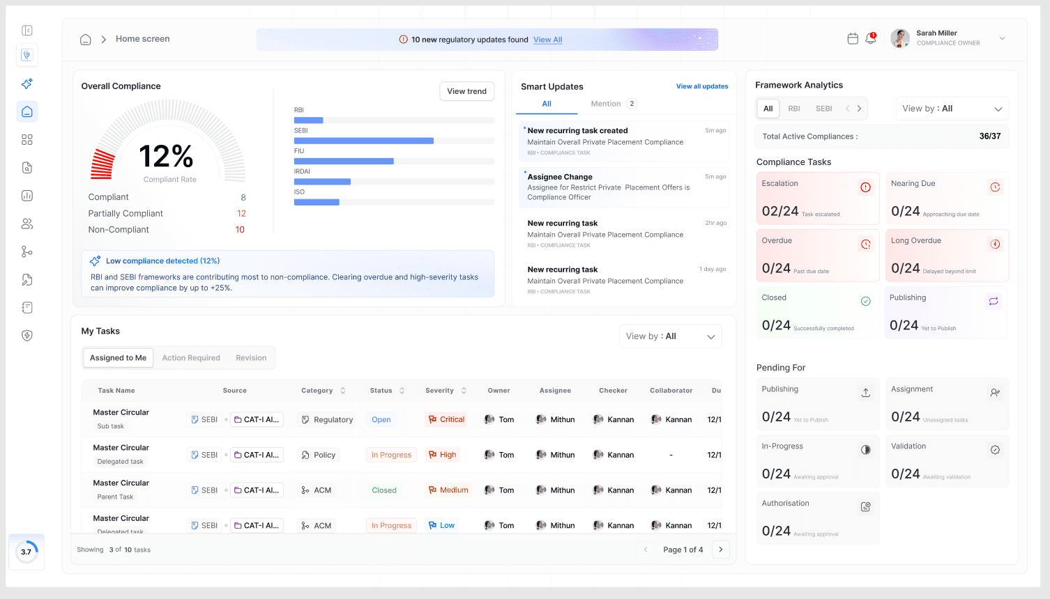 Connect compliance tasks across RBI, SEBI, IFSCA, and internal frameworks to eliminate duplication and manual rework.